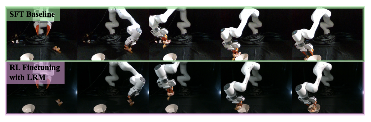 In real-world task, the SFT baseline (38.3% success) fails due to execution errors or distributional shifts. Our LRM-refined policy successfully corrects these failures, boosting the real-world success rate to 51.7%. These results consistently validate the effectiveness of our specialized LRM as a robust reward generation model for robotic reinforcement learning.